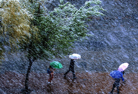 People walk against heavy snow in Changchun, northeast China's Jilin province, April 23, 2008. Heavy snow fell in the city on Wednesday morning. [Xinhua]