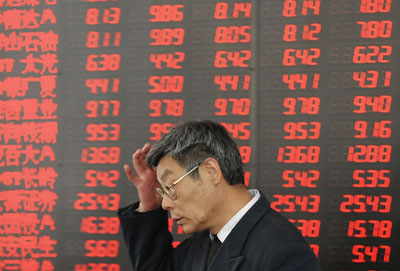A man gestures in front of an electronic board showing stock information at a brokerage house in Hefei, Anhui province April 24, 2008. China's main stock index soared over 9 percent in frenzied trade on Thursday after the government cut the share trading tax, seeking to boost investors' confidence. [Agencies]