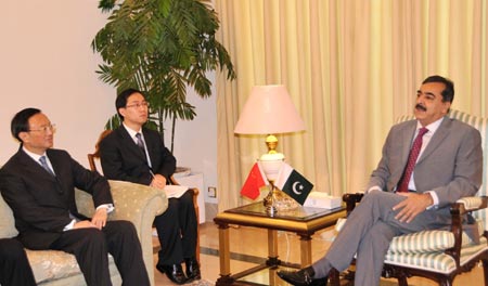 Pakistani Prime Minister Yousaf Raza Gilani (R) meets visiting Chinese Foreign Minister Yang Jiechi (L) in Islamabad, capital of Pakistan, April 26, 2008. [Xinhua]