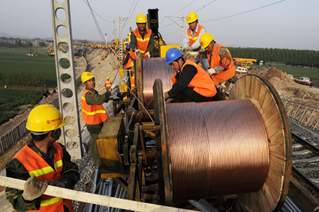 Workers repair the damaged section of the Jinan-Qingdao Railway in East China's Shandong Province, April 28, 2008. [Xinhua] More photos for train collision