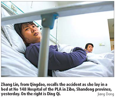 Otherwise the collision could have killed her instantly, she told China Daily as she lay in a bed at No 148 Hospital of the People's Liberation Army in Zibo, Shandong province.