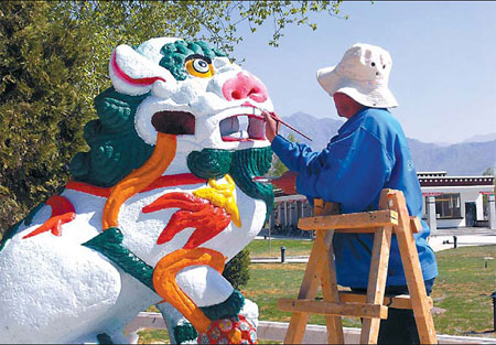 A Tibetan aritst paints the nose of a stone lion at the main entrance of Norbu Lingka, the former summer residence of Dalai Lamas. [China Daily]