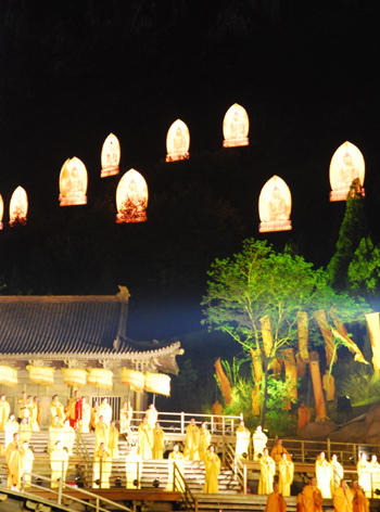 A music ritual entitled "Zen Shaolin" is staged in the Daixian Valley of the Songshan Mountain, near the Shaolin Temple in Central China's Henan Province, April 20, 2008. [Chinadaily.com.cn]
