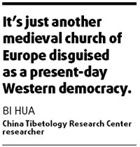 The Dalai Lama is the holy representative of Tibetan religious worship, but both the "government-in-exile" and its constitution consider him the top leader, which shows that under the guise of a division of powers and democratic politics, the "government" in fact features strong religious and feudal factors, she said.