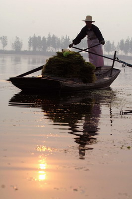 A fisherman prepares to fish in Baiyangdian Lake in North China's Hebei Province in the early morning of April 29, 2008. Some 60 million cubic meters of water was diverted into the lake to ensure Beijing's water supply during the Olympics and improve the capital's ecological environment. [Xinhua]