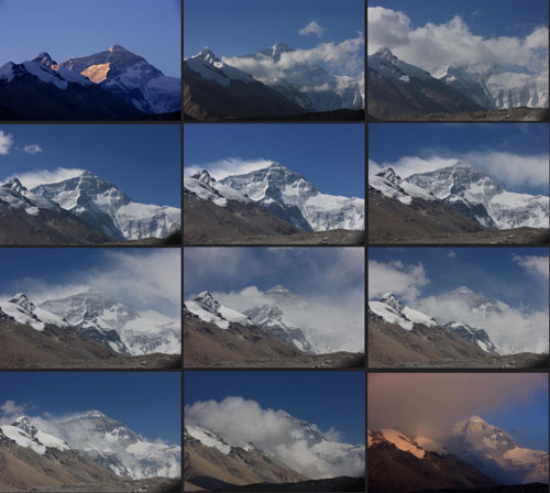 A group of combined photo shows Mt. Qomolangma in southwest China's Tibet Autonomous Region from day to night. The mountain is expecting the Olympic flame. [Xinhua]