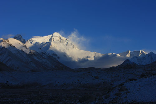 Snow-capped Mt. Qomolangma in southwest China's Tibet Autonomous Region is seen in this picture taken on May 3, 2008. The mountain is expecting the Olympic flame. [Xinhua]