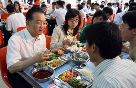 Wen then walked into the dormitories and chatted with the students. "I learnt things that are not taught in classrooms. The Premier knows so much about law and puts such strong emphasis on law, I will study hard and make my contributions to the country," said postgraduate Chen Xuemeng. Around 12 o'clock, Wen walked into the school's cafeteria and had lunch with the students. The Premier expressed his concern over the recent price rise, and asked the students if they could afford the daily food and whether the scholarship could help them solve their difficulties. To make sure that the college students' living standards are not influenced by the price rise, the government has allocated 20 yuan of subsidy per month for each college student, with those from very poor families receiving 40 yuan each per month, Wen said. At 12:30, the premier left the campus as large crowds of students waved goodbye. "The Premier's visit makes this Youth Day special and meaningful," said student Yang Kunzhang, "The premier's expectations direct the way of our future efforts". |