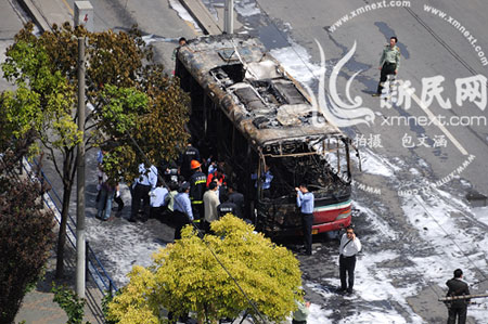 Police officers investigate a bus which exploded and burned in a fire in Shanghai, May 5, 2008. Three passengers were killed and 12 others injured in the incident. The cause of the explosion is still yet unknown. [xmnext.com]