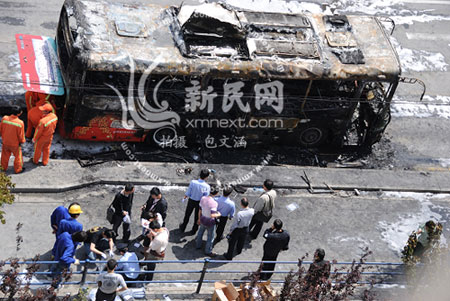 An overview of a burned bus in Shanghai, May 5, 2008. Three passengers were killed and 12 others injured in the incident. The cause of the explosion is still yet unknown. [xmnext.com]