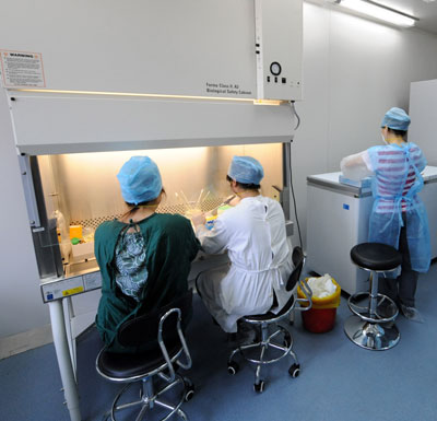 Experts sent by the Ministry of Health work in a laboratory in Fuyang, Anhui Province May 6, 2008 to tackle the deadly infectious disease caused by EV71 virus. [Xinhua]