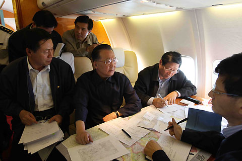Premier Wen Jiabao(C) arranges relief work with officials onboard the plane to quake-stricken area on May 12, 2008. [Xinhua]