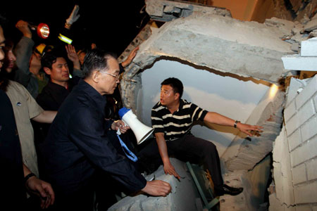 Premier Wen Jiabao talks through an amplifier to people trapped in a collapsed hospital building in Dujiangyan, Sichuan Province May 12, 2008. In Sichuan Province, at least 8,533 have died in the quake, with the epicenter in Wenchuan county. [Xinhua]