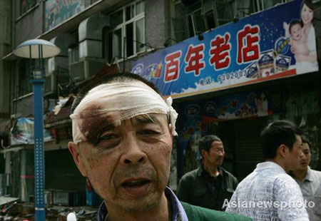 This elderly man tells how terrible the Monday's earthquake was in Hanwang town, Mianzhu City of Sichuan Province May 14, 2008. [asianewsphoto]