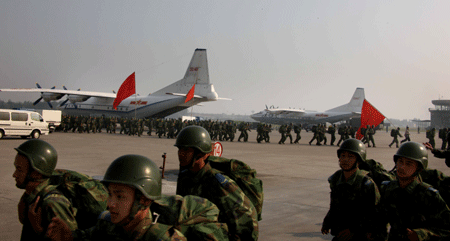 Soldiers board a plane bound for the quake-hit Wenchuan at an airport in Kaifeng, Central China's Henan Province, May 13, 2008. [Xinhua]