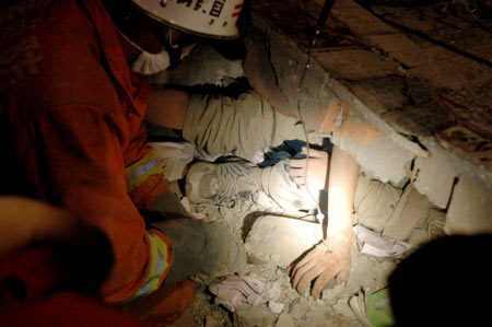Fire fighters manage to remove the debris to rescue a trapped middle school student called Yang Hong in quake-stricken Beichuan County, Southwest China's Sichuan Province, May 15, 2008. Yang was rescued after being trapped for nearly 60 hours in the rubble. [Xinhua]