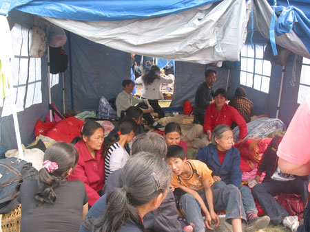 Earthquake survivors rest in a tent provided by the local government at a rescue center in Mianzhu county, one of the worst quake-hit areas in Southwest China's Sichuan Province, May 16, 2008. [chinadaily.com.cn/by Rong Xiandong in Mianzhu]