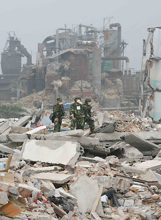 Soldiers wear facemasks in the rubble of a chemical factory in Shifang, Sichuan province May 16, 2008. [Agencies]