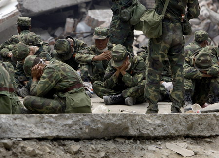 People's Liberation Army (PLA) soldiers take a break from trying to find survivors in the earthquake devastated city of Beichuan, located around 150 km north of Chengdu, in Sichuan Province May 16, 2008. China struggled to bury its dead and help tens of thousands of injured and homeless on Friday when a powerful aftershock brought new havoc four days after an earthquake thought to have killed more than 50,000. [Agencies]