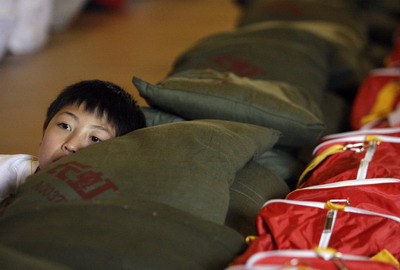 An injured boy rests his head on his pillow at a centre for missing schoolchildren in the city of Mianyang, located around 100 km north of Chengdu, in Sichuan Province May 16, 2008. [Agencies]