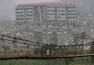 A nurse and a soldier help a patient (C) to cross a bridge in the city of Beichuan, located around 150 km north of Chengdu, in Sichuan Province May 16, 2008. [Agencies]