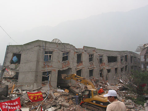 Rescuers try to rescue Bian Gangfen from rubbles at a collapsed building of a chemical factory in Yinghua, Shifang, Sichuan Province on May 17, 2008. [Photo by Rong Xiandong/chinadaily.com.cn]