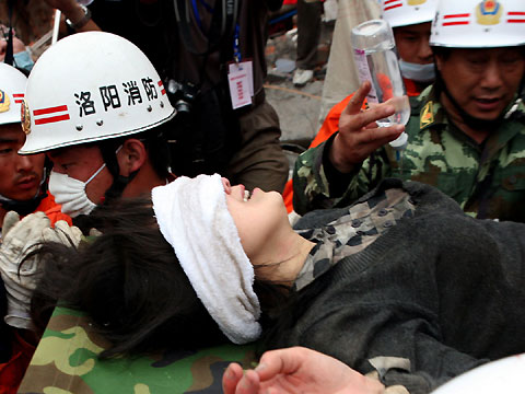 Bian Gangfen is carried to an ambulance after enduring 124 hours under rubbles at Yinghua Town, Shifang, on May 17, 2008. [Photo by Huo Yan/chinadaily.com.cn]