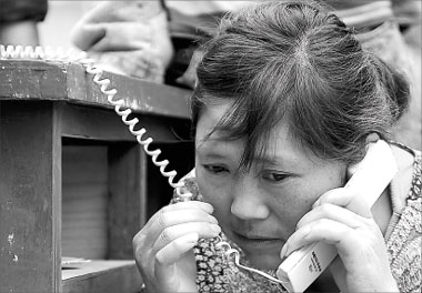 A woman phones her relatives to let them know she's safe as soon as telephone services were restored in Pingwu county, Sichuan province, yesterday. [China Daily]