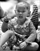 A boy makes a victory sign at Jiuzhou Stadium, one of the shelters in Mianyang. [China Daily]