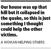 "Our house was up that hill but it collapsed in the quake, so this is just something I thought could help the other victims," said a woman stoking a wood fire under a huge pot of water, who like many helping out refused to give her name.