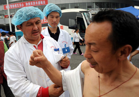 An earthquake survivor receives medical treatment at an evacuation center in Mianyang, Southwest China's Sichuan Province, May 17, 2008. Medical experts from Xinjiang Uygur Autonomous Region take part in the disaster relief work. [Xinhua]