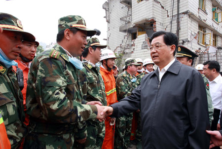Chinese President Hu Jintao (R) shakes hands with a rescuer when he inspects disaster relief work in the quake-hit Xuankou Town of Wenchuan County, Southwest China's Sichuan Province, May 17, 2008. [Xinhua]
