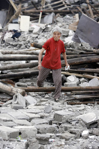 A woman walks inside her damaged house in the earthquake-hit township of Hanwang, in Mianzhu city north of Chengdu, Sichuan province, May 17, 2008. [Agencies]