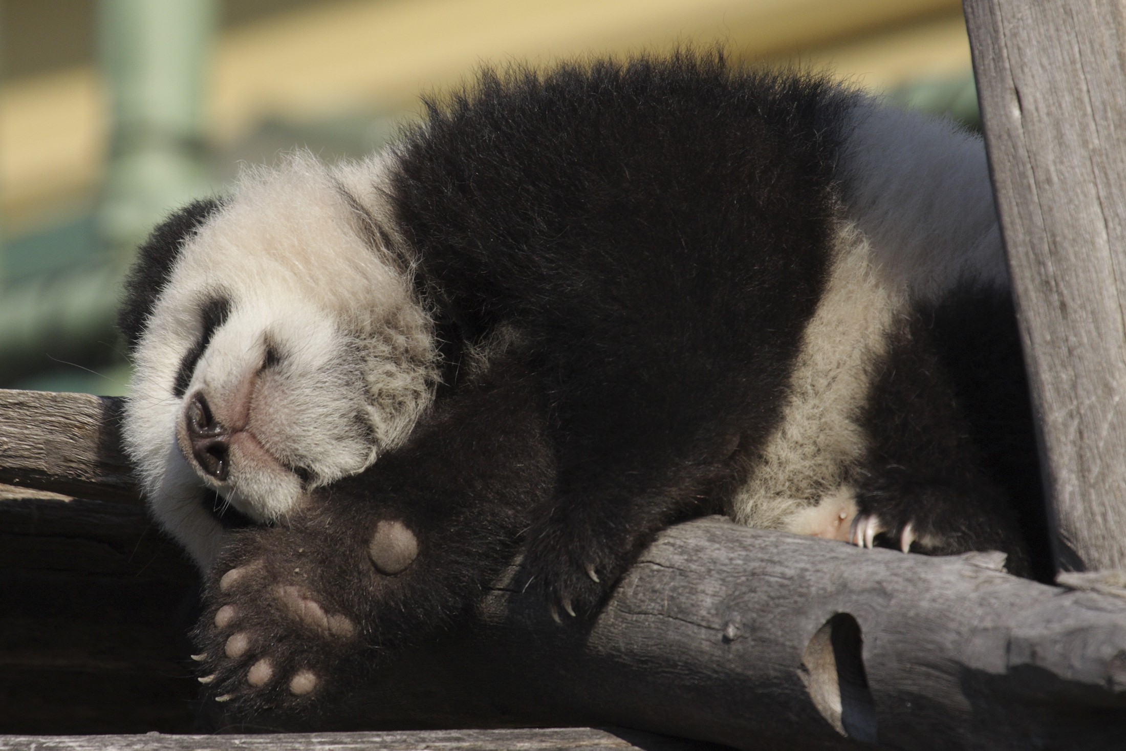 | Seven-month-old giant panda cub Fu Long looks rests as he makes his first outdoor appearance in the zoo in Vienna March 30, 2008. Three giant pandas are missing after last week's massive earthquake. [Agencies] |