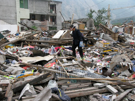 A woman looks through the debris of her collapsed house on Sunday in Yingxiu, Wenchuan County, one of the worst-hit areas in last Monday's quake. [China Daily]