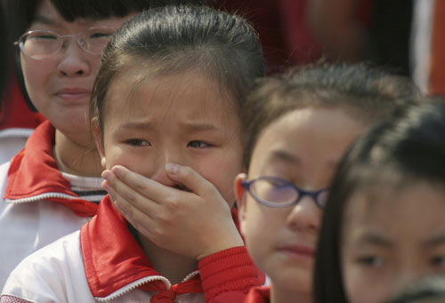 Primary school students mourn during their morning assembly at a school in Tianjin municipality, May 19, 2008, for the victims who died during the earthquake in Sichuan province. China began three days of national mourning on Monday for more than 30,000 victims of an earthquake that struck a week ago. [Agencies]