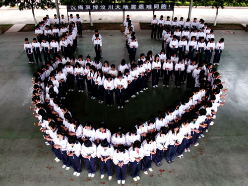 Students stand in the form of a heart and 5.12, the date of the earthquake, at a high school in Ruian of Zhejiang Province May 19, 2008. A nation-wide ceremony was held on 14:28 on Monday, seven days after a massive earthquake hit Sichuan. [Xinhua]