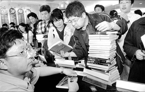 Famous Chinese writers, including Sichuan-native A Lai (left), take part in a fundraising event in Beijing Book Store, on May 18, for the earthquake victims. [File photo]