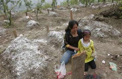A woman holding her daughter mourns at her husband Feng Qiang's grave in the earthquake-hit Hongbai town, Sichuan Province May 20, 2008. Feng had been a teacher at Hongbai Middle School. China raised the number of dead or missing from a devastating earthquake to more than 70,000 on Tuesday, as rescuers found more survivors eight days after the huge tremor hit. [Agencies]