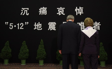 US President George W. Bush (L) and first lady Laura Bush pay their respects to the victims of the earthquake in China, during their visit to China's Embassy in Washington, May 20, 2008. The pair also signed a condolence book at the embassy. The Chinese characters read "We mourn for the victims of May 12 Earthquake". [Agencies]