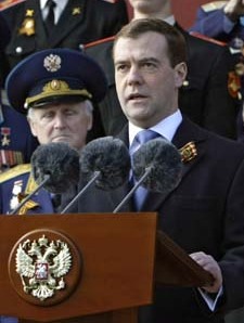 | Russia's President Dmitry Medvedev speaks during a World War II victory ceremony in Moscow's Red Square May 9, 2008. [Agencies] |