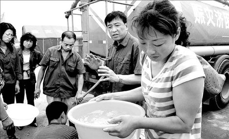 Quake survivors sheltering at an unfinished stadium in the city of Mianzhu, Deyang, Sichuan province, collect water last Friday from a tanker sent by the local government. [China Daily]