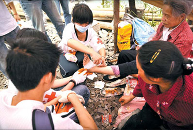 A volunteer (center) treats an elderly earthquake victim at a temporary shelter in Shimen in the mountains of Sichuan on May 17. [AFP]