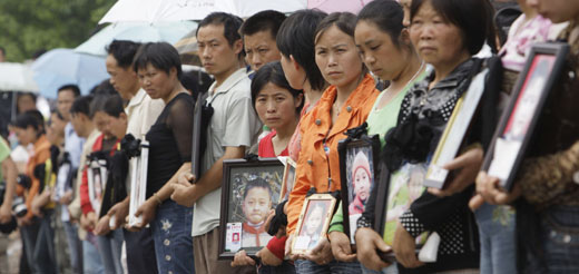 More than 100 parents holding portraits of their dead children attend a memorial at the ruins of the destroyed Fuxing primary school in the earthquake-hit Wufu town of Mianzhu county, Sichuan province May 21, 2008. [Agenices]