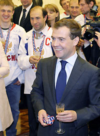 Russia's President Dmitry Medvedev toasts during a meeting with the Russian national ice hockey team in Moscow, May 20, 2008. [Agencies]