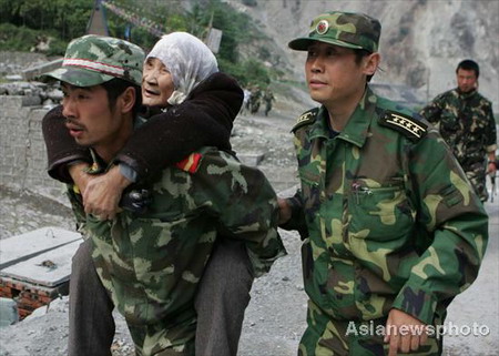A serviceman carries an injured villager to an army helicopter at a hilly village near the Wenchuan County, Sichuan province on May 22, 2008. A military helicopter Thursday lifted five injured villigers to hospital 240 hours after last Monday's devastating earthquake. [Asianewsphoto]