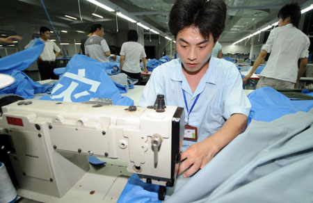 A worker sews tents in a factory in Huzhou, Zhejiang Province May 22, 2008. Tent manufacturers in Zhejiang are urged to speed up production to meet the needs of quake survivors in Sichuan. [Xinhua]