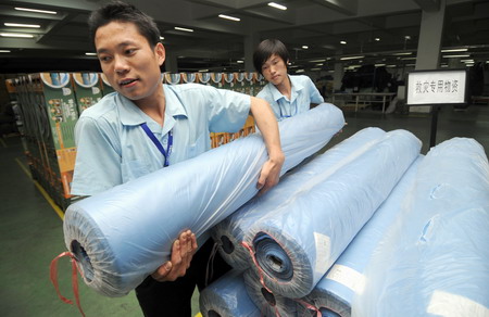 Two workers carry tents down from a shelf in a factory in Huzhou, Zhejiang Province May 22, 2008. Tent manufacturers in Zhejiang are urged to speed up production to meet the needs of quake survivors in quake-hit Sichuan. [Xinhua]