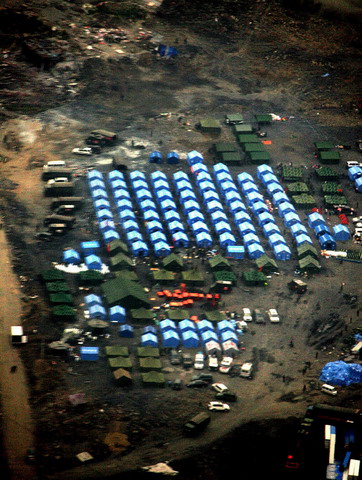 An aerial view of a temporary location for quake survivors in Yingxiu town, one of the most affected area in quake-hit Sichuan Province May 21, 2008. [Xinhua]