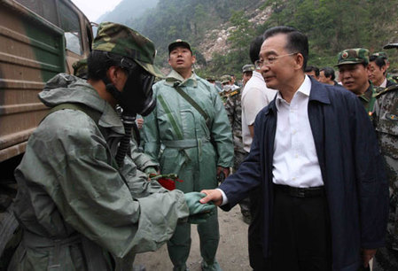 Premier Wen Jiabao shakes hands with a soldier in Beichuan County May 22, 2008. The premier started his second visit to the quake-battered zone from Thursday. [Xinhua]